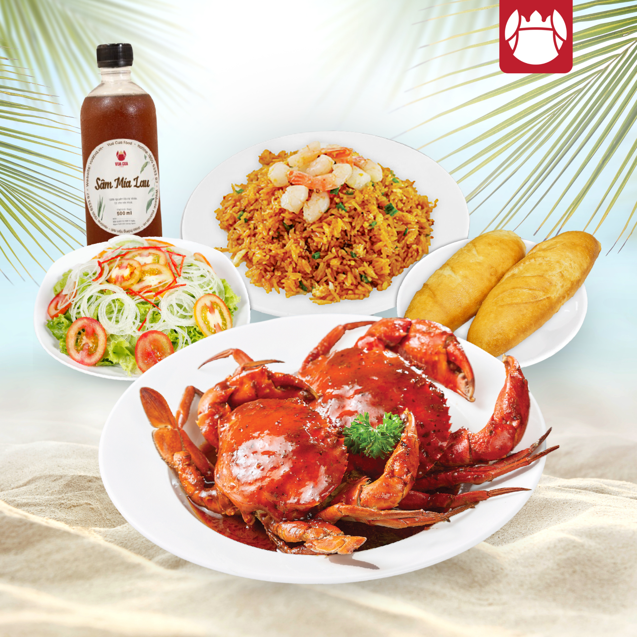 Set ăn cân đối hợp lý, đảm bảo tiết kiệm hơn đáng kể cho túi tiền của bạn, bao gồm: 2 con cua thịt, 1 cơm chiên tôm, 1 sald trộn, 1 chai sâm, 2 ổ bánh mì tươi, 2 khăn lạnh. Bạn có thể kết hợp các loại salad trong thực đơn tại nhà Vua Cua, giúp cân bằng khẩu vị, đồng thời kích thích vị giác tốt hơn cho quá trình thưởng thức món ăn.